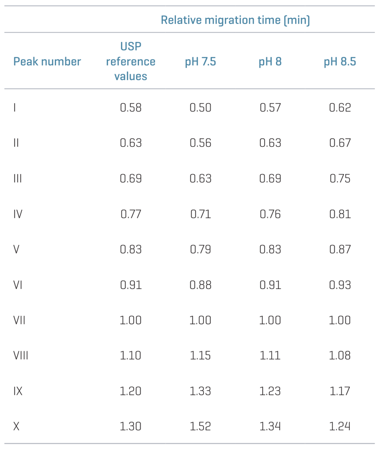 USP established relative migration time (RMT) values for the 10 peaks to facilitate the correct peak assignment. It is important to note that The RMT is provided for reference use only and should not be considered a system suitability parameter. RMT also plays an important role in determining the proper pH of the background electrolyte. Table 1 shows the USP RMT of the 10 peaks for reference, and the RMT values were obtained using BGE with pH 7.5, 8.0, and 8.5. Based on these results, results from pH 8 showed the closest values to the RMT guidelines established by USP.