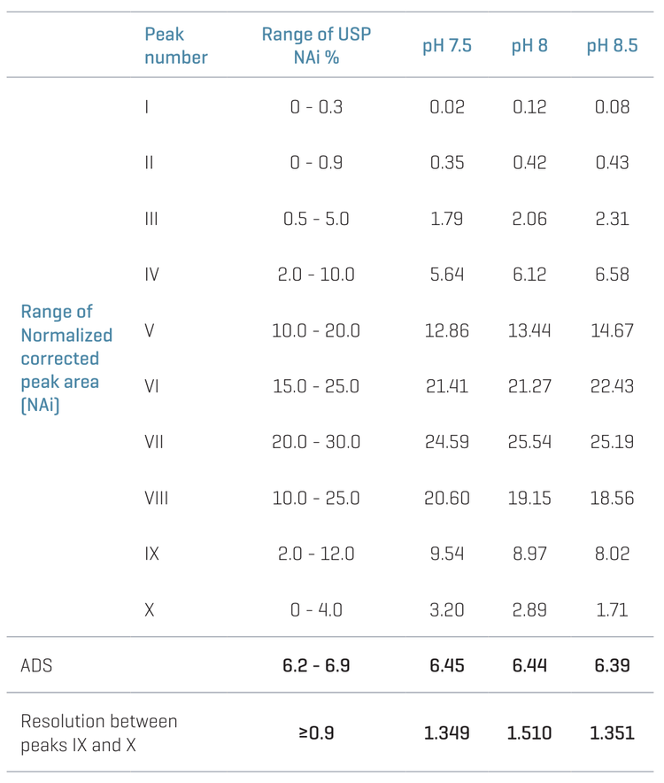 USP has established the range for the normalized corrected peak area % for each 10 peaks (I, II, through X). Table 2 shows the USP range for NAi for each of the 10 peaks, and the NAi shown was obtained using BGEs with pH 7.5, 8, and 8.5. Table 2 also shows the calculated ADS.