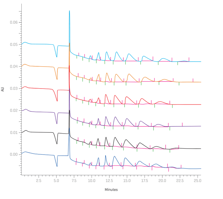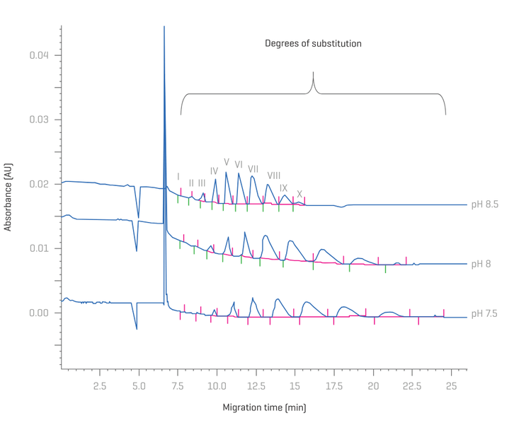 Figure 1 shows an overlay of 3 electropherograms of the various degrees of substitution of betadex sulfobutyl ether sodium using BGE with pH 7.5 (bottom), pH 8 (middle) and pH 8.5 (top). The separation pattern clearly shows the higher the BGE’s pH, the faster the separation. Additionally, the peaks become sharper compared to the shape of the peaks separated at pH 7.5 or 8.