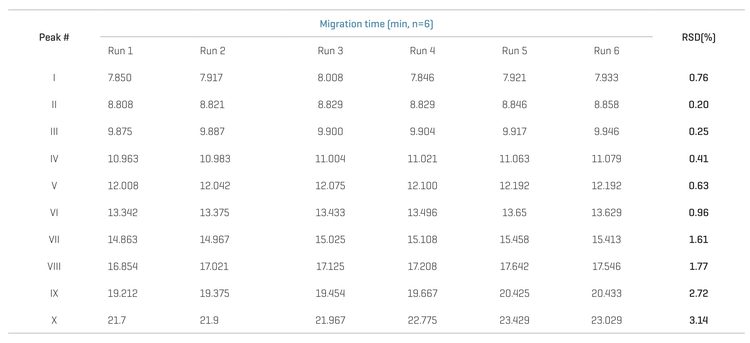 Figure 2 shows an overlay of 6 runs of betadex sulfobutyl ether sodium at pH 8, and Table 3 shows the reproducibility of the migration time for 6 replicate runs for each of the 10 peaks corresponding to the 10 degrees of substitution. Even though USP does not specify a requirement for reproducibility of migration time, the %RSD values obtained at pH 8 were acceptable.