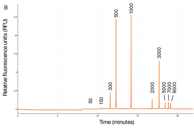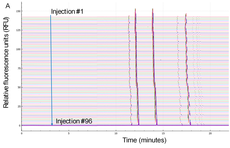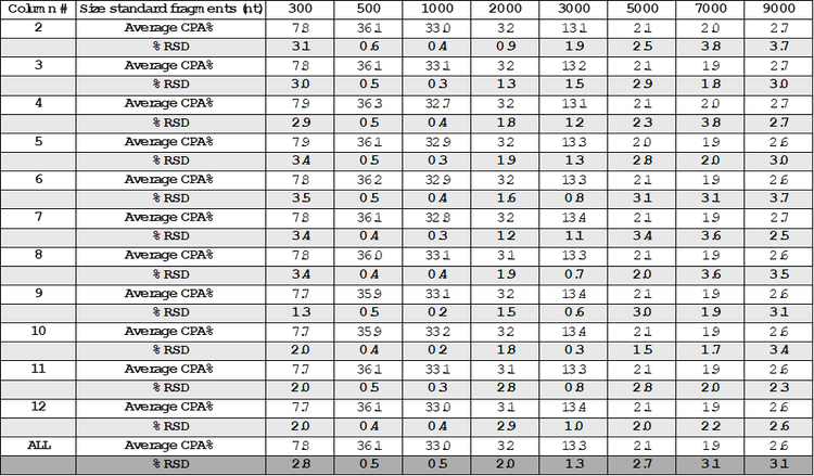 The intra-capillary reproducibility of CPA% for the standard fragments in the ssRNA ladder is summarized in Table 3. For each capillary, 11 injections were made. The average CPA% was calculated for each capillary. The %RSD was better than 4.0% for all capillaries and for the 8 standard fragments listed, demonstrating excellent intra-capillary reproducibility. The overall %RSD for 88 sample injections for each standard fragment was lower than 3.5%, indicating outstanding overall assay reproducibility.