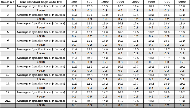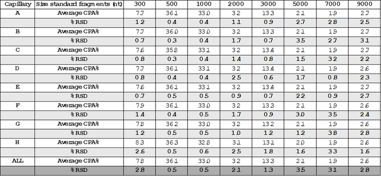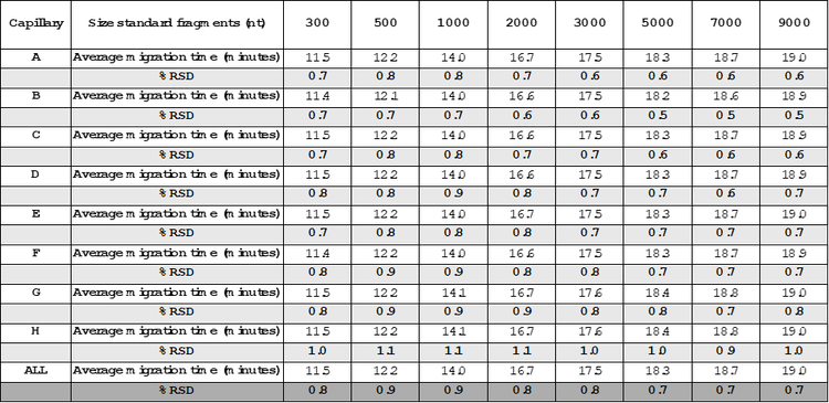 Table 4 summarizes the inter-capillary reproducibility of migration times for the 8 standard fragments. For each column of the BioPhase sample plate, eight injections were performed using different capillaries, and the average migration time was determined. The %RSD for all columns and all eight standard fragments was consistently below 0.6%, confirming excellent inter-capillary reproducibility. The overall %RSD for 88 sample injections for each standard fragment was lower than 1.0%, indicating high overall assay reproducibility and robustness.