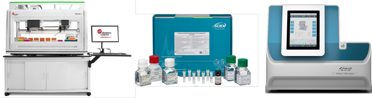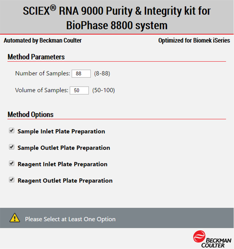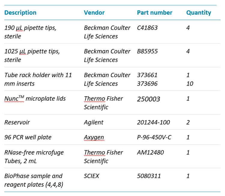 Materials: The RNA 9000 Purity & Integrity kit (P/N: C48231, Figure 2, middle panel), sample loading solution (SLS, P/N: 608082), and the BioPhase BFS capillary cartridge - 8 x 30 cm (P/N: 5080121) were from SCIEX (Marlborough, MA). Rainin LTS filter tips were from Mettler Toledo (Oakland, CA). Nuclease-free water (NFW) (P/N: AM9932) was obtained from Thermo Fisher Scientific (Waltham, MA). The 0.2 µm syringe filter (P/N: 4612) was from PALL (Port Washington, NY). Part numbers for pipette tips, tubes, reservoirs, and plates used in the sample and reagent preparation workflow are listed in Table 1. A pair of custom-made outlet plate adapters was provided by Beckman Coulter Life Sciences (Indianapolis, IN).