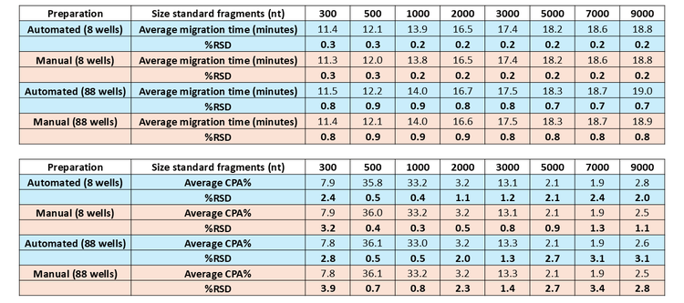 Comparison of automated and manual sample and reagent preparation: The samples and reagents were prepared either with the Biomek i7 Hybrid Automated workstation or manually, following the same design, with an ssRNA ladder in column #1 and 88 samples in columns 2-12. The sample plates were loaded onto the BioPhase 8800 system and separated using the RNA 9000 Purity & Integrity kit. Results are summarized in Table 6. Automated and manual preparation showed no significant differences in average migration times, %RSD of migration times, or average CPA% values for size‑standard fragments. Differences appeared only in CPA% variability (%RSD): in the 8‑well comparison, manual preparation was slightly more consistent, except for the 300 nt fragment, where automated preparation performed better. In the 88‑well comparison, automated preparation was generally more consistent, with the exception of the 7000 and 9000 nt fragments, where both methods produced nearly identical results. Overall, both methods are equivalent in performance, with automation offering greater reproducibility for larger sample sets.