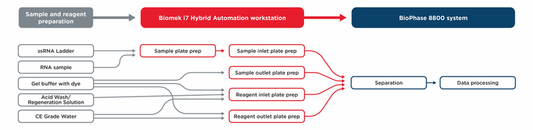 Automated sample and reagent preparation: To demonstrate the Biomek i7 Hybrid Automated workstation’s capability for the RNA 9000 Purity & Integrity kit, a full plate was processed (88 samples in addition to 8 ssRNA ladder standards). The single-stranded RNA (ssRNA) ladder and gel buffer solution with dye were prepared off-deck. Subsequently, all preparation for the sample inlet plate, reagent Inlet plate, sample outlet plate, and reagent outlet plate was performed directly on the Biomek i7 Hybrid Automated workstation. Following these steps, the BioPhase 8800 system executed the sample separation and data processing. An overall workflow is shown in Figure 3. This automated method offers flexibility and scalability, designed to prepare anywhere from 8 to 88 samples in increments of 8. The user can select specific method options to run them separately, or execute the entire process from start to finish with a single user interface to keep the labware and the reagents on deck.