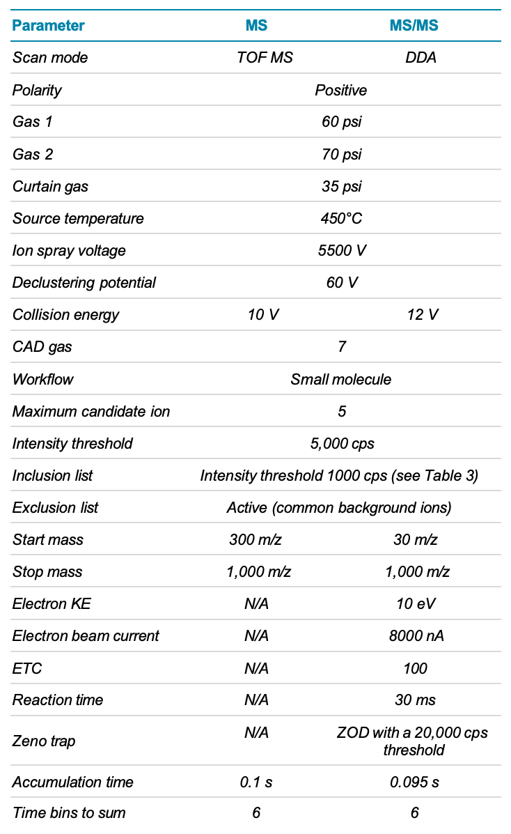 Mass spectrometry: Data were acquired using SCIEX OS software on the ZenoTOF 7600 system in positive polarity. Data were collected from a single injection, using a combination of data-dependent acquisition (DDA) and a targeted approach that implemented an inclusion list. Relevant MS parameters for the EAD method are described in Tables 2 and 3.