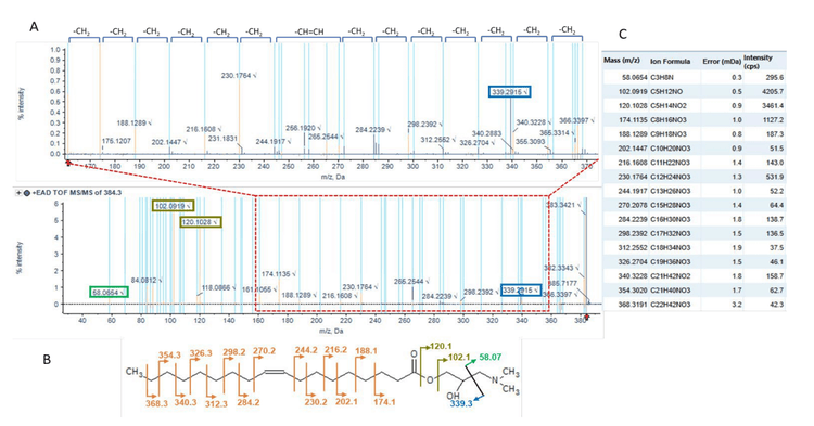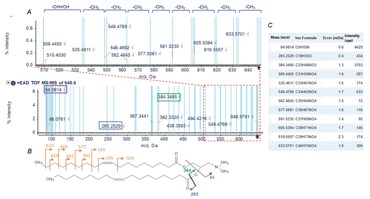 The m/z observed by TOF MS for the singly charged DODAP matched the theoretical m/z of DODAP within 1 ppm. This m/z was selected for fragmentation using EAD. Figure 4 shows an overview of the interpretation of the structure of DODAP using Molecule Profiler software. Figure 4A shows a zoomed-in view of the EAD-based MS/MS spectrum. The blue highlights on the fragment ions indicate assignments of fragment ions to a proposed structure or an ion formula, which are listed in Figure 4C. EAD provides many structurally informative fragment ions for the structural interpretation of DODAP. The partial fragment structure corresponding to the selected formula is indicated in Figure 4B. Ions at m/z 384 and 265 indicate ester bond breakage. A series of fragment ions identified indicate methyl group loss from one end of the alkyl chain. Ions at m/z 535 and 509 confirmed the localization of the double bond.