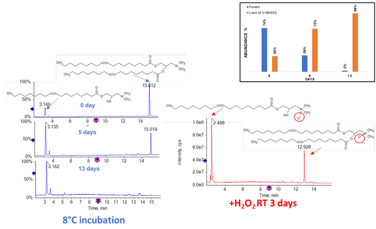 The use of LNPs as drug delivery devices has dramatically increased since the advent of the COVID-19 vaccine and recent gene therapy therapeutics. It has been demonstrated that lipid impurities used in the LNP can attenuate the effects of the active pharmaceutical ingredient (API). A recent study reported that N-oxidation of ionizable lipids might lead to covalent modification of ribonucleotides and a loss of mRNA potency.1 It is still unknown if the oxidized form of lipid degradants can also form adducts to mRNA and reduce downstream translation efficiency. Thus, it is important to have a workflow to thoroughly characterize the structure of ionizable lipids and their related impurities and degradants.