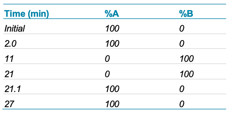 Mobile phase A is described above, and mobile phase B was 60:40, acetonitrile/methanol with 10mM ammonium acetate. The chromatographic conditions used are described in Table 1.