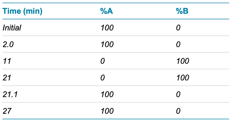 Sample preparation: A stock solution of MC3 (2 mg/mL) was diluted 1:10 in mobile phase A, which contained 15% water, 30% acetonitrile and 55% methanol with 10mM ammonium acetate.