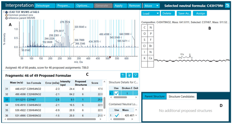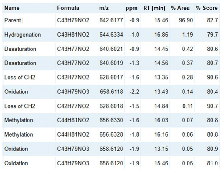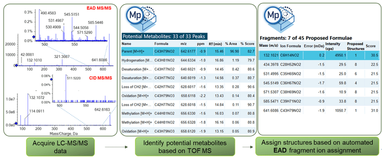The use of LNPs as drug delivery devices has dramatically increased since the advent of the COVID-19 vaccine and recent gene therapy therapeutics. It has been demonstrated that lipid impurities among the components of the LNP can attenuate the effects of the active pharmaceutical ingredient (API). A recent study reported that N-oxidation of ionizable lipids might lead to covalent modification of ribonucleotides and a loss of mRNA potency.8 To ensure product quality, detailed and sensitive characterization of the ionizable lipid and its related impurities is necessary. Accurate mass spectrometry (MS) can be used to identify potential impurities by comparing the measured and calculated m/z and isotope patterns. However, structural confirmation leveraging MS/MS facilitates the localization of altered sites in the chemical. Thorough structural elucidation is complex, especially for ionizable lipids with highly symmetrical structures. This necessitates powerful and intuitive processing software to overcome the cumbersome and time-consuming manual interpretation.