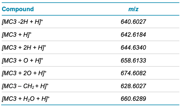 - Automatic identification, thorough structural elucidation and relative quantification of MC3 and related impurities were accelerated by the automatic annotation of TOF MS/MS spectra based on proposed structures in Molecule Profiler software