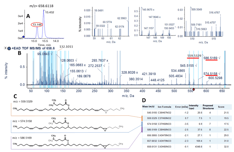 The first peak (Figure 6A, RT = 13.15 min) was assigned to a structure with oxidation on the alky chain on the C6/C31 double bond. Signature ions observed at m/z = 559, 574 and 586 were assigned to the structure with oxygen incorporated on the C6/C31 double bond by the Molecule Profiler software. The structure of oxidized MC3 is shown in Figure 6C. The parts of the structures highlighted in bold correspond to the fragment ions at m/z 559.5, 574.5, and 586.5 that support the oxygen incorporation on the C6 double bond. The absence of peaks at m/z = 148.1, 61.05, and 511.5 (inset above Figure 6B), used as signature ions for the N-oxidation described below, further confirmed that the added oxygen was not in the head group..
