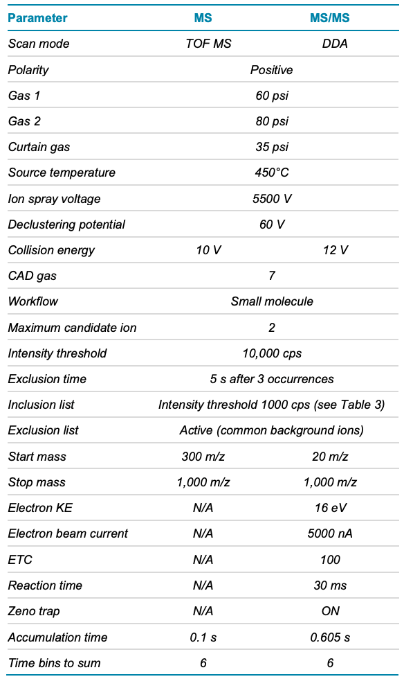 Mass spectrometry: Data were acquired using SCIEX OS software on the ZenoTOF 7600 system in positive polarity. Data were collected from a single injection, using a combination of data-dependent acquisition (DDA) and a targeted approach that implemented an inclusion list. Relevant MS parameters for the EAD method are described in Tables 2 and 3.