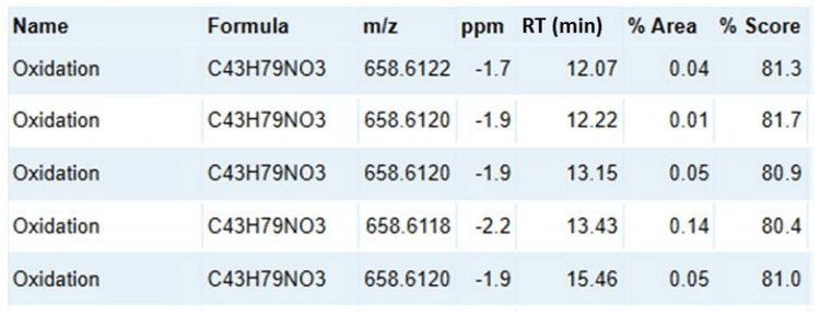 N-oxidation of ionizable lipids can lead to covalent modification of ribonucleotides and a loss of mRNA potency.8 The Molecule Profiler software identified several oxidized isomers as lowabundance impurities, shown in Figure 5. The identification list aligns with the peaks observed in the XIC at m/z = 658 (Figure 2, aqua trace, annotated with +O). A detailed analysis by Molecule Profiler software on 2 of the oxidized impurities corresponding to peaks at retention times (RT) 13.15 min and 13.43 min (Figure 6A) are presented below