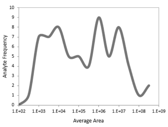 To successfully implement a large panel lipidomic screen, a large dynamic range of the assay is essential. With the sensitivity of the SCIEX 7500 System, >5.5 orders of magnitude dynamic range were achieved (Figure 3). Another issue to overcome is the extensive isobaric overlap between different lipid classes and species. Using a normal phase gradient compared to reverse phase allows the user to achieve class separation and minimizes interferences from isobaric species (Figure 4). With the established method, a complete snapshot of the lipid composition can be detailed for a formulated liposome or LNP. Employing the sMRM Pro Builder template on the profiling data enables a user to further filter results. By filtering the data by total area, lipid species of each class based on a user-specified area threshold are shown (Figure 5). By filtering the panel containing over 2100 MRMs to focus on LPL (such as LPC or lysophosphatidylethanolamines, known as LPE), oxidized lipids or other undesired elements that can contribute to an unstable liposome, users can modify the MRM list easily based on their matrix or focus for analysis.