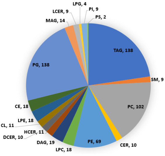 Here, an extruder kit that is commercially available was used to create the liposome formulation. Egg PC paste was used as the natural mixture for extrusion in order to showcase the characterization of lipids from LNPs using LC-MS. Using a 0.1 µm polycarbonate filter, 1 mL of egg solution was passed through the filter and the subsequent mixture containing the liposomes was collected. After lipid extraction, the sample was reconstituted and run using the Comprehensive Targeted Method for Global Lipidomics Screening.5 The method is optimized for a targeted assay on a broad panel of 20 lipids classes containing over 2000 transitions. The sMRM list is customizable enabling the addition or removal of entire classes or individual lipid species based on the matrix or application. In Figure 2, the pie chart represents the number of lipid species found by lipid class. It provides a rough distribution of the lipid makeup of the egg matrix after extrusion.