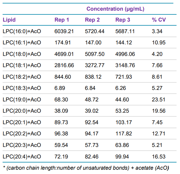 Quantification can be necessary when shifting from a natural product to a defined liposome or LNP. Historically, relative quantification with one internal standard per class using Avanti’s SPLASH mix has been the industry standard while analyzing large lipid panels. However, the differential fragmentation inherent to lipids with varying chain lengths and degrees of unsaturation cannot be corrected with a single internal standard alone. To close that gap, Lipidyzer Platform standards were designed providing accurate quantification for a variety of lipid classes (Table 1). 8 The kit contains 54 unique labeled internal standards that spans 13 lipid classes. With multiple standards per class that have variable chain lengths and degrees of unsaturation, the quantitative bias for individual molecular species is less than 10%.8 Table 1 displays the concentrations for the class of LPL using the internal standards from the Lipidyzer Platform kit.
