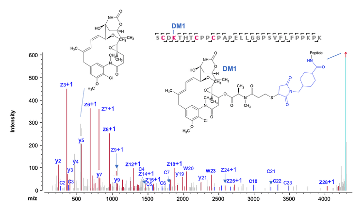 Figure 4 shows the deisotoped EAD spectrum of the DM1- containing HC peptide (HC222-251) from trastuzumab. EAD led to the generation of extensive c/y/z fragments with or without DM1, enabling the confident identification of the peptide sequence and precise localization of the payload. Specifically, the detection of an unmodified c3 and DM1-containing c4 fragments pinpointed the position of DM1 to the Lys225 residue among 3 potential conjugation sites (Lys225, Lys249 and Lys251) in the peptide HC222-251. The Lys249 residue was also identified as a DM1 conjugation site from EAD of the peptide HC229-232 (data not shown). In addition to generating dominant sequence-related fragments, EAD of HC222-251 produced a diagnostic fragment of DM1 at m/z 547.2 (Figure 4), facilitating the confirmation of the payload structure.