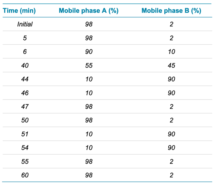 Chromatography: A 4 µL (4 µg) sample of the trypsin/Lys-C digest was separated with a CSH C18 column (2.1×100 mm, 1.7 μm, 130 Å, Waters) using an ExionLC AD system. Mobile phase A was water with 0.1% formic acid and mobile phase B was acetonitrile with 0.1% formic acid. Table 1 shows the LC gradient used for peptide separation at a 300 μL/min flow rate. The column temperature was maintained at 50°C in the column compartment.
