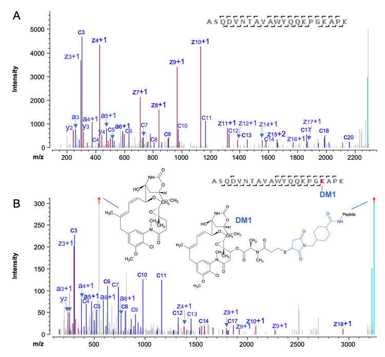 Figure 5 displays the EAD spectra of the peptide LC25-45 with or without the DM1 payload. EAD provided excellent fragmentation of 2 peptides for confident sequence confirmation. Similar to the peptide HC222-251 described above, the sequence of LC25-45 contains 3 potential sites of DM1 conjugation (Lys39, Lys42 and Lys45). The detection of the fragment at m/z 547.2 indicated the presence of the DM1 payload in this LC peptide. The Lys42 residue was determined to be the DM1 conjugation site in this LC peptide based on the detection of the unmodified z3+1 and DM1-containing z4+1 ions (Figure 5B).