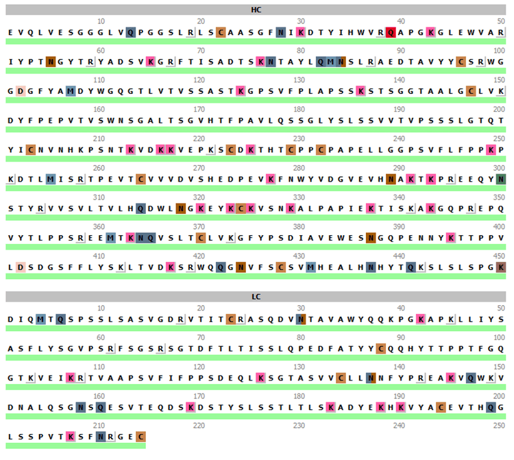 Figure 3. Complete sequence coverage of the LC and HC subunits of trastuzumab from T-DM1. EAD-based peptide mapping led to 100% sequence coverage of LC and HC of trastuzumab in a single injection.
