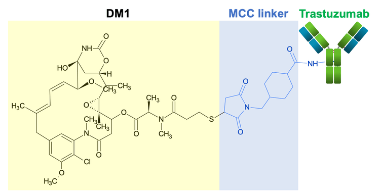 Figure 2. Structure of the T-DM1 ADC. T-DM1 consists of the cytotoxin DM1 (in yellow background) conjugated to trastuzumab via the MCC linker (in blue background), which is covalently bound to the primary amines on the mAb.