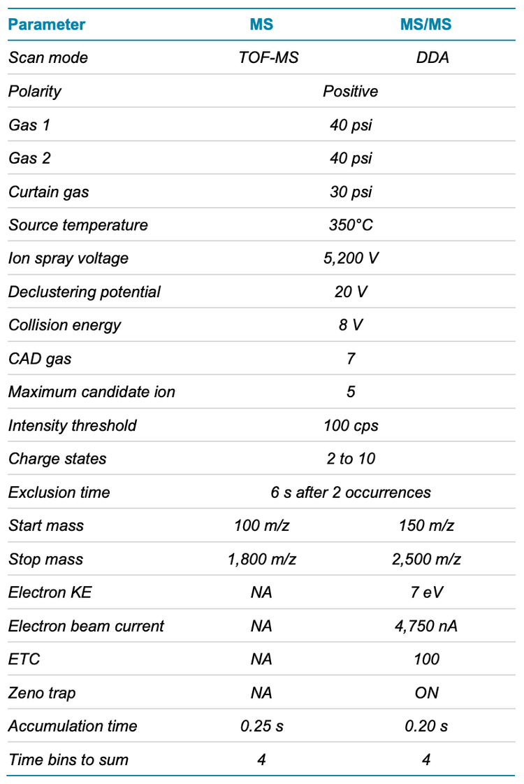 Mass spectrometry: EAD DDA data were acquired using SCIEX OS software on the ZenoTOF 7600 system (SCIEX). Detailed TOF MS and EAD DDA method parameters are summarized in Table 2.