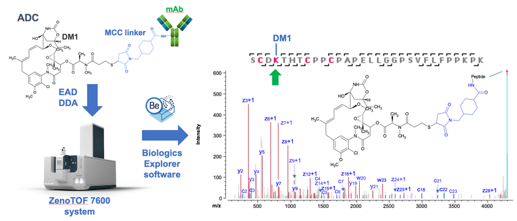 Figure 1. The EAD-based peptide mapping workflow offered by the ZenoTOF 7600 system enables confident sequence confirmation and accurate determination of the payload conjugate sites in T-DM1. The cytotoxic payload, DM1, was retained in the EAD fragments, leading to its accurate localization in the ADC using Biologics Explorer software. MCC: maleimidomethyl cyclohexane-1-carboxylate.