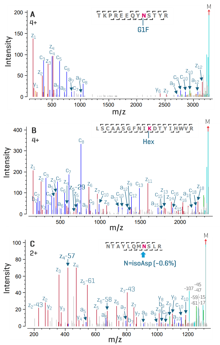 Figure 6 shows an example of glycopeptide characterization and isomer differentiation using EAD. The ability of EAD to preserve labile PTMs in the fragments led to precise localization of the glycan G1F in the glycopeptide TKPREEQYNSTYR (Figure 6A) and the glycation moiety (Hex) in the glycated peptide LSCAASGFNIKDTYIHWVR (Figure 6B).