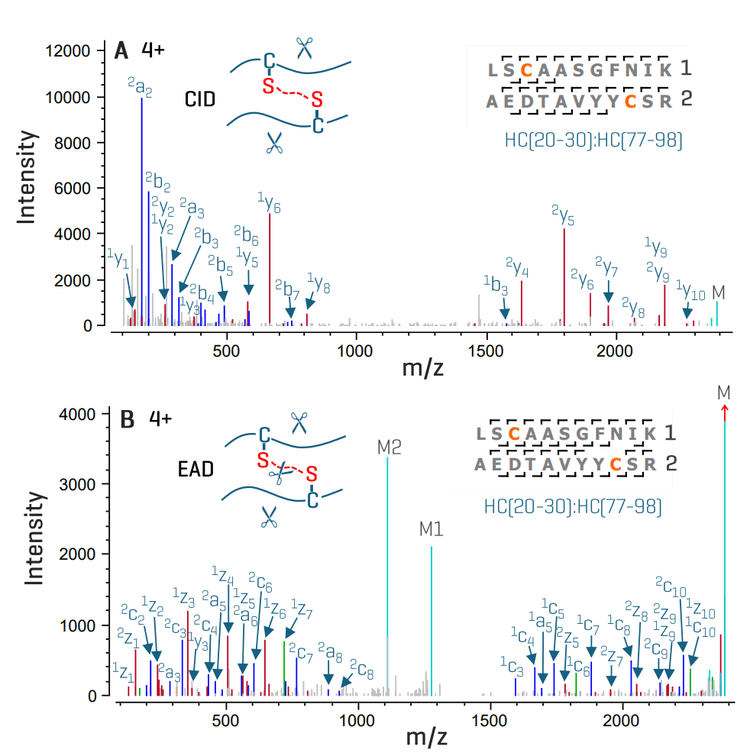 Figure 4 shows the CID and EAD spectra of a disulfide-linked peptide from the HC. While both MS/MS techniques produced high-quality data for confident identification of this peptide, EAD generated more sequence fragments for higher peptide coverage by cleaving the disulfide bond (Figure 4B). The cleavage of the disulfide bond also led to the detection of two intact peptides (M1 and M2 in Figure 4B), providing additional mass confirmation of 2 disulfide-linked peptides.