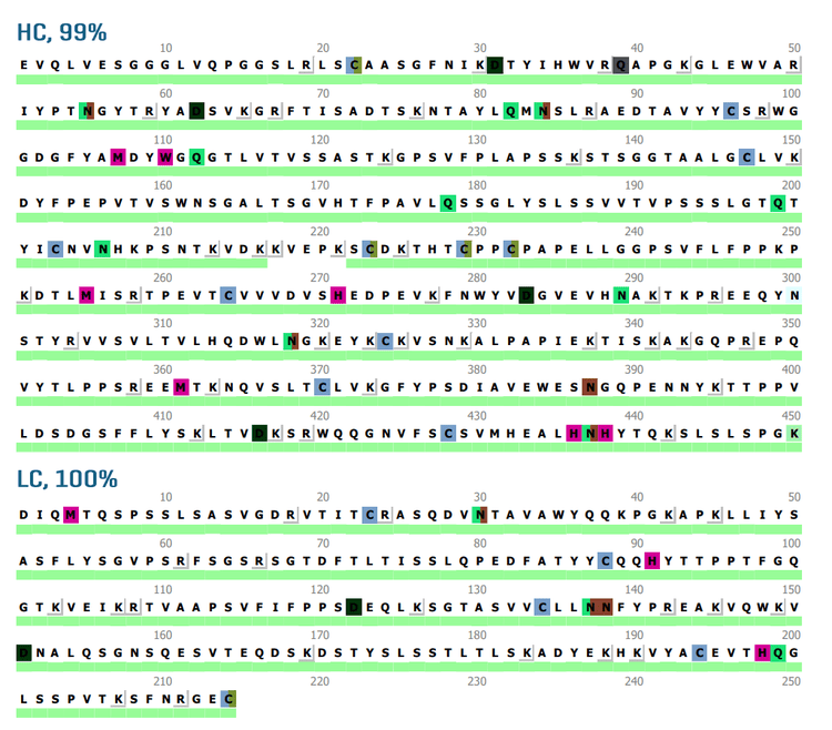 Figure 2 shows high sequence coverage of HC and LC (³99%) from the reduced T-DXd digest obtained using the EAD-based peptide mapping workflow in a single injection. Similar results were also obtained for the T-DXd digest prepared under the non-reduced condition (data not shown). In addition to obtaining high sequence coverage of T-DXd, the EAD DDA method identified peptides carrying the DXd payload, intra-chain disulfide linkage or various PTMs, such as glycosylation, glycation, oxidation and deamidation, for in-depth characterization of these PQAs. Fast and sensitive EAD DDA can be employed as a single-injection method for comprehensive biotherapeutic characterization3-9 or combined with CID DDA in a single method10 to leverage the complementary capabilities of these 2 MS/MS approaches.