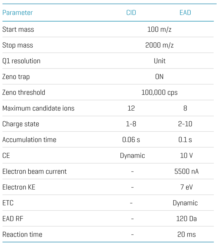 Previous work has demonstrated the high MS/MS sensitivity, fragmentation reproducibility and versatile capabilities of the EAD-based peptide mapping workflow for comprehensive biotherapeutic characterization.3-9