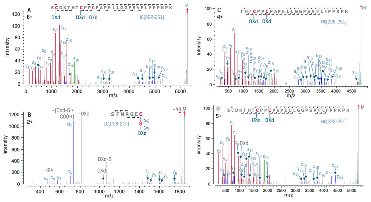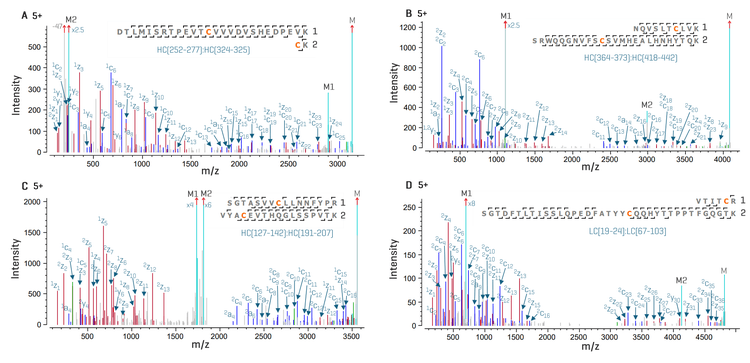 High-quality CID and EAD data allowed the confirmation of all the 6 intra-chain disulfide linkages on the T-DXd (4 on HC and 2 on LC). Figure 5 shows EAD spectra of 3 disulfide-linked peptides from HC and 1 from LC. Similar to the example described above (Figure 4B), excellent EAD fragmentation allowed confident identification of these disulfide-linked peptides with various lengths.