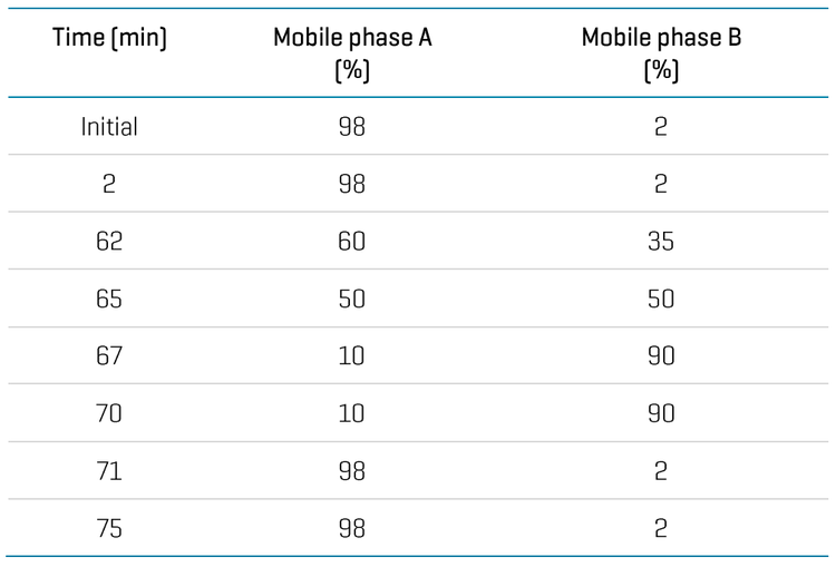 Liquid chromatography: Tryptic peptides were separated with the gradient displayed in Table 1 using an ACQUITY BEH C18 column (2.1 × 150 mm, 1.7 µm, 130 Å, Waters). A flow rate of 0.25 mL/min was used for the chromatographic separation. The column was kept at 60°C in the column oven of an ExionLC AD system (SCIEX). Mobile phase A was 0.1% formic acid (FA) in water and mobile phase B was 0.1% FA in acetonitrile.