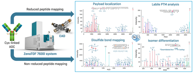 Comprehensive characterization of antibody sequence, drug payload and PTMs is essential to ensuring the quality, safety and efficacy of ADC products.1,2 Peptide mapping is a common approach for the comprehensive characterization of antibody-based therapeutics in addition to intact mass analysis.3-10 Collision-based MS/MS techniques employed by traditional peptide mapping approaches cause extensive fragmentation of the payload and cleavage of labile PTMs, leading to the loss of site-specific information about these important moieties. By comparison, EAD can preserve labile modifications for their accurate localization.3-5 EAD can also generate signature fragments for unambiguous differentiation of amino acid isomers, such as Asp vs. isoAsp and 3- vs. 4-hydroxyproline.6-8 Additionally, EAD provides superior results for disulfide bond mapping compared to collision-based MS/MS approaches.9