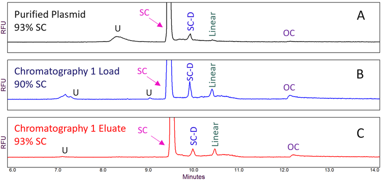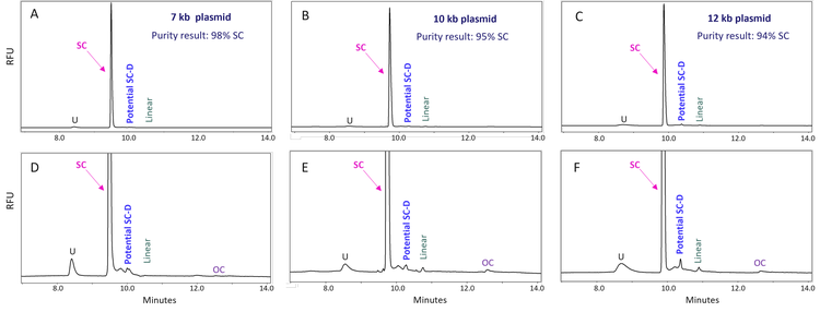 Successful purity monitoring throughout the plasmid production process: Previous work has shown that plasmid analysis by CE-LIF with the DNA 20 kb Plasmid and Linear kit has the potential to analyse in-process plasmid samples due to an excellent limit of detection (LOD) of < 5 pg/µL.12 Monitoring the plasmid quality across the production process is beneficial for process control and improvement. A 12 kb plasmid was purified by ion exchange chromatography. Samples from the “Chromatography 1 Load”, “Chromatography 1 Eluate”, and “Purified Plasmid” stages of the plasmid production process were buffer exchanged and analysed using the DNA 20 kb Plasmid and Linear kit. As shown in Figure 3, panels A to C, the purity for the “Chromatography 1 Load” sample was 90% with the detection of the linear, OC, potential SC-D isoforms, and the unknown impurities. The purity of the “Chromatography 1 Eluate” sample was 93%, with a relatively lower amount of linear, OC, potential SC-D, and unknown impurities than in the “Chromatography 1 Load” sample, indicating the improvement in purity by the chromatography process. The purified plasmid sample had a 93% purity with very low linear and no detectable OC isoform, indicating further removal of linear and OC isoforms by post-chromatography steps in the production process. Similar results were obtained with a 7 kb plasmid and a 10 kb plasmid (data not shown). These results demonstrate that CE-LIF can successfully monitor the plasmid purity throughout the plasmid production process. Moreover, plasmid purity analysis of in-process samples without buffer exchange yielded results comparable to those with buffer exchange (data not shown), further enhancing the efficiency of the workflow.