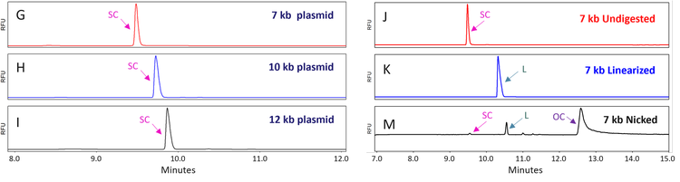 As an example of isoform identification, panels J, K, and M of Figure 2 present a stacked view of electropherograms obtained with the undigested 7 kb plasmid sample (red trace), the linearized 7 kb plasmid (blue trace), and the nicked 7 kb plasmid (black), highlighting the identification of peaks corresponding to the SC, the linear and OC isoforms. These platform methods for plasmid purity and peak identification were also developed for plasmids ranging from 6 to 15 kb (data not shown) and can be readily applied to analysing various plasmids for AAV production.