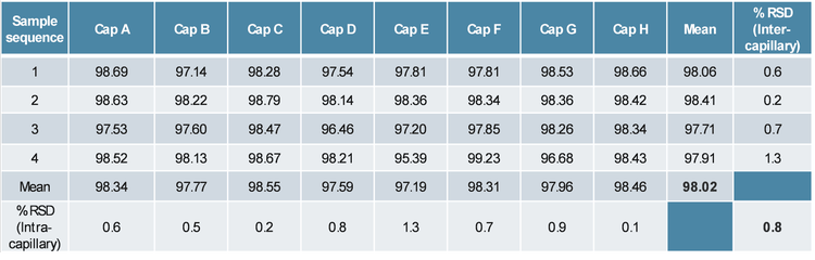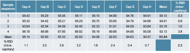 Excellent assay reproducibility for plasmid purity analysis on the BioPhase 8800 system: Since the BioPhase 8800 system is a multi-capillary system that separates 8 samples simultaneously and can analyse up to 96 samples in a sequence, it is essential to assess the inter-capillary and the intra-capillary variations. The purified 7 kb and 12 kb plasmids were diluted in the DNA 20 kb Plasmid and Linear sample buffer to 5 ng/μL and analysed to evaluate the inter- and intra-capillary repeatability using the DNA 20 kb Plasmid and Linear kit. The results, including mean and %RSD values of the plasmid purity, are summarized in Tables 1 and 2. For the 7 kb plasmid, %RSD values of plasmid purity were within 1.5% across 8 different capillaries or between 4 different days in the same capillary. The overall average purity value of 32 injections was 98% for this sample, with an overall %RSD of 0.8%. For the 12 kb plasmid, %RSD values of plasmid purity were within 4.0% across 8 different capillaries or between 4 different days in the same capillary. The overall average purity value of 32 injections was 94% for this sample, with an overall %RSD of 2.3%. These results demonstrate high assay reproducibility for plasmid purity analysis on the BioPhase 8800 system using the DNA 20 kb Plasmid and Linear kit.
