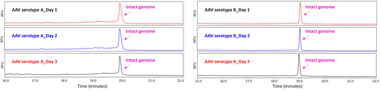 To assess the assay reproducibility of the genome integrity analysis, the purified genomes from an AAV serotype A sample and an AAV serotype B sample were analysed on three different days on the BioPhase 8800 system using the RNA 9000 Purity & Integrity kit. As shown in Figure 6, profiles in electropherograms obtained on 3 different days were consistent for both samples. With both serotypes, the relative migration times of the intact genome peaks were consistent among the runs on 3 different days, indicating excellent assay reproducibility. The profile of the AAV serotype B in Figure 6 looked slightly different from the one in Figure 5A. This is because the AAV serotype B samples in Figure 5A and in Figure 6 were from two different batches both of which were commercially sourced. This observation indicates that the genome integrity workflow can be used to monitor batch-to-batch variations.