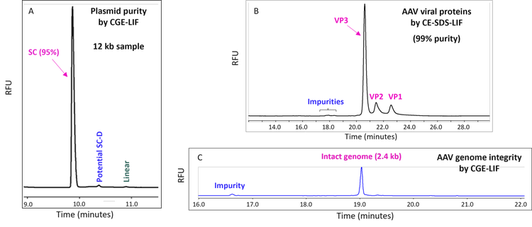 Platform CE workflows for plasmid and AAV purity and genome integrity assessments were developed across the AAV production process