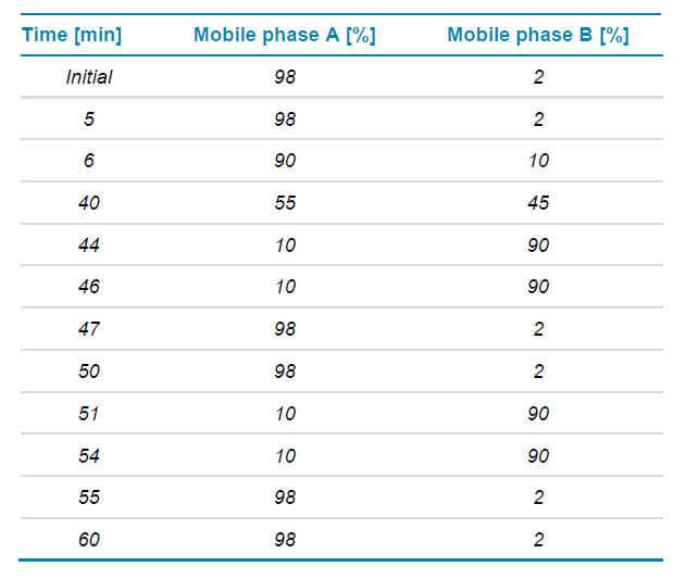 Chromatography: 10 μL (4 μg) of the trypsin/Lys-C digest were separated with a CSH C18 column (1.7 μm particle size, 130 Å, 2.1×100 mm, Waters) using an ExionLC system. The mobile phase A consisted of water with 0.1% formic acid, while the organic phase B was acetonitrile 0.1% formic acid. A gradient profile was used at a flow rate of 300 μL/min (Table 1). The column temperature was maintained at 50°C.