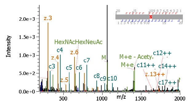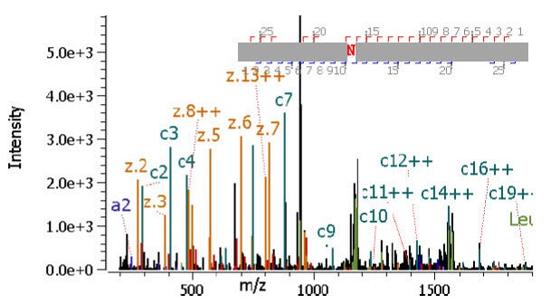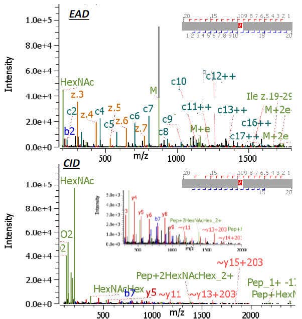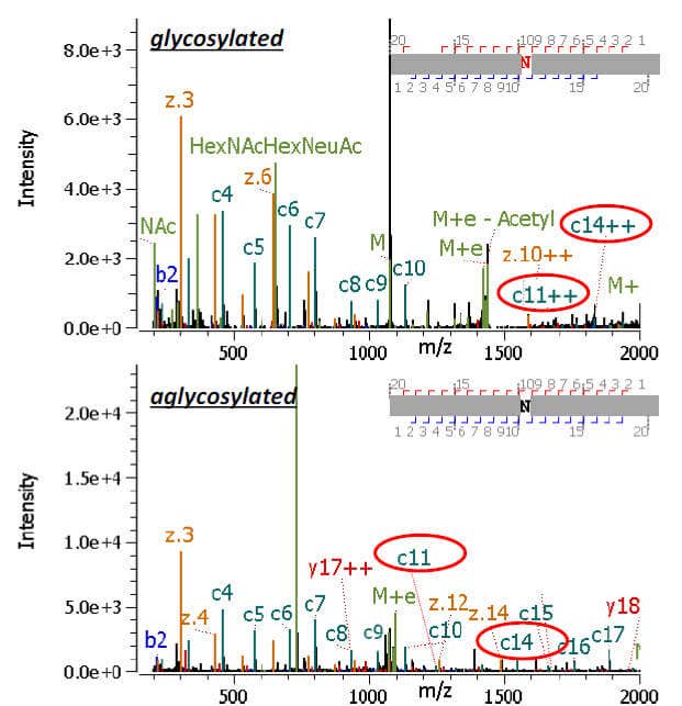 The existence of aglycosylated peptide species is common in heavily glycosylated proteins such as vaccines (Figure 4). As expected, the series of c-ions from c 3 to c 10 are identical for both peptides. However, from c 11-c17 (where the glycan is attached at the asparagine), the c-ion series differed from each other drastically. This example nicely illustrates how EAD can provide both peptide ID and the location of the glycan.