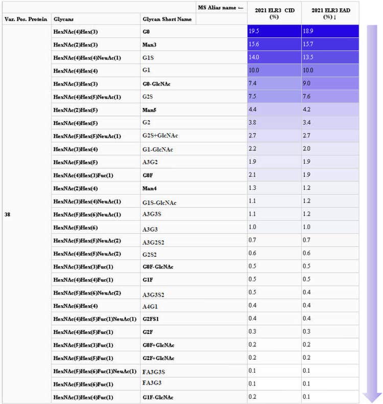 A summary of all identified glycans (≥ 0.1%) at N38 and N223 was generated based on the extracted ion chromatograms using Byos (example for N38 in Figure 6). The results show consistent relative abundances between CID and EAD, providing EAD is not only capable for ID of such peptides but also for reproducible relative quantification.