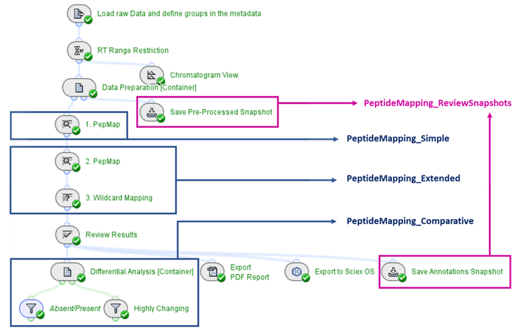 Figure 1. Layout of the PeptideMapping_Comparative workflow in the Biologics Explorer software v.1.0.2. Blue boxes highlight additional activity nodes within each workflow template that advance the in-depth characterization process. The pink boxes highlight activity nodes used to save intermediate data and results at different processing stages.