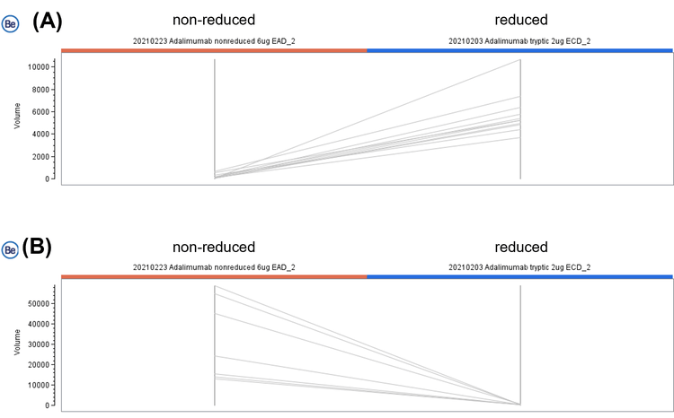 Figure 8. Example plot from the  Highly changing  activity node.  The results are demonstrating a profile plot of representative peptides that are at least 10-fold different in abundance between reduced and non-reduced adalimumab samples, due to different sample preparations. Carbamidomethylated peptides are highly abundant in reduced samples but not present in the non-reduced samples (A), while peptides with intact disulfide bonds are present in the non-reduced samples and not in the reduced samples (B).