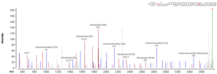Figure 7. Consolidated and deisotoped MS/MS spectrum of the 5+ charge state of the modified peptide TPEVTCVVVDVSHEDPEVKFNWYVDGVEVHNAK demonstrating several C and N termini fragments that support D25 modification.