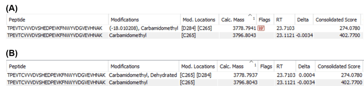 Figure 5. Representative example for identifying unspecified modifications using  Wildcard Mapping  activity node.  (A) Peptide: TPEVTCVVVDVSHEDPEVKFNWYVDGVEVHNAK identified by  Wildcard Mapping  to be modified with a loss of -18.010 Da from aspartic acid residue. (B) TPEVTCVVVDVSHEDPEVKFNWYVDGVEVHNAK, with a confirmed dehydration modification from aspartic acid residue following the addition of the modification in  2.   Pepmap