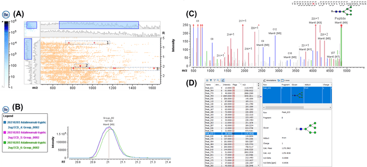 The Biologics Explorer software is prepackaged with 3 cumulative CHO N-glycan libraries of increasing complexity and diversity to support various applications, where the largest library contains 136 N-glycans. Additionally, over 26,000 N-glycans compiled in the GlycomeDB database can be searched. The contents of all libraries can be viewed and edited from the Library Browser, where customized libraries can also be built. Investigation of adalimumab via the PeptideMapping_Simple workflow template successfully identified the expected glycan modifications at position N301 with relative abundances consistent with those previously reported. The N-glycan Man6 had a low occupancy of 1.3%. To verify the accuracy of this annotation, the 3 glycopeptides bearing Man6 modification at position N301 were selected in the  Modifications Table  in the  Review Results  activity node. The ion map was then further interrogated, with the help of the Cluster Table to confirm that the identified Man6 clusters (resulting from the different charge states and adduct ions) do belong to the same peptide species and are eluting at the same retention time (Figures 4A, B). Moreover, the associated consolidated and deisotoped MS/MS spectra were investigated for the sequence ladder and identified  c- and  z- ions (Figures 4C, D). This highlights the benefit of the soft fragmentation inherent to EAD, as it resulted in peptide fragments bearing the intact glycan, unequivocally validating the position and type of the N-glycan as well as extensive peptide backbone fragmentation verifying the peptide sequence (Figure 4C).