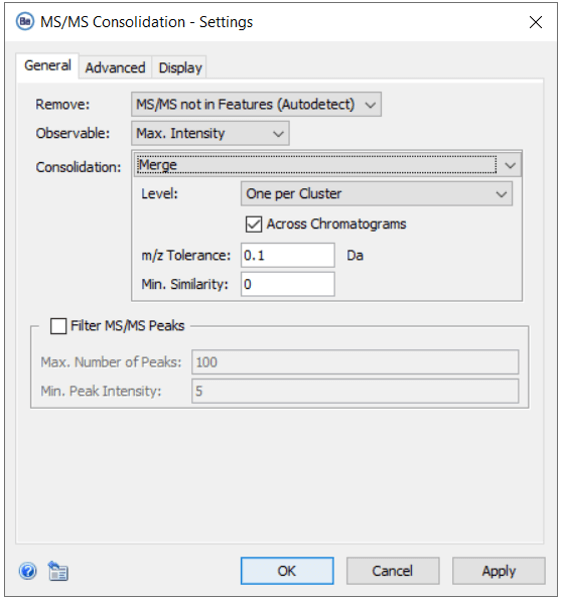 Figure 3.  MS/MS Consolidation  activity node settings.  The settings can be set to provide different levels of data consolidation.